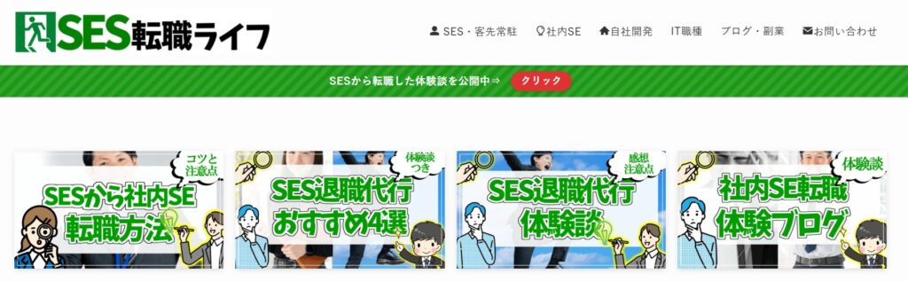 SES転職ライフは、SES(客先常駐)を経験したエンジニアが運営する転職支援ブログです。社内SE、自社開発、ITコンサルなど多様なキャリアへ進むための方法や転職成功例・体験談をわかりやすく紹介。転職エージェントの活用術や求人の見極め方、退職・副業に関する記事もあり、SESに悩むエンジニアのキャリア設計を具体的にサポートする情報サイトです。
