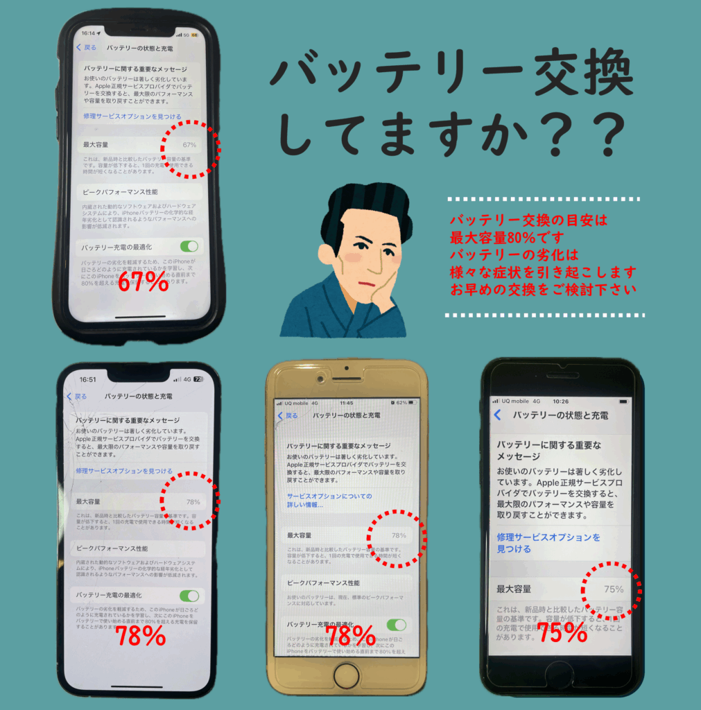 最近、「充電の減りが早い」「電源が急に落ちる」「充電してもすぐ残量が減る」などの症状はありませんか?